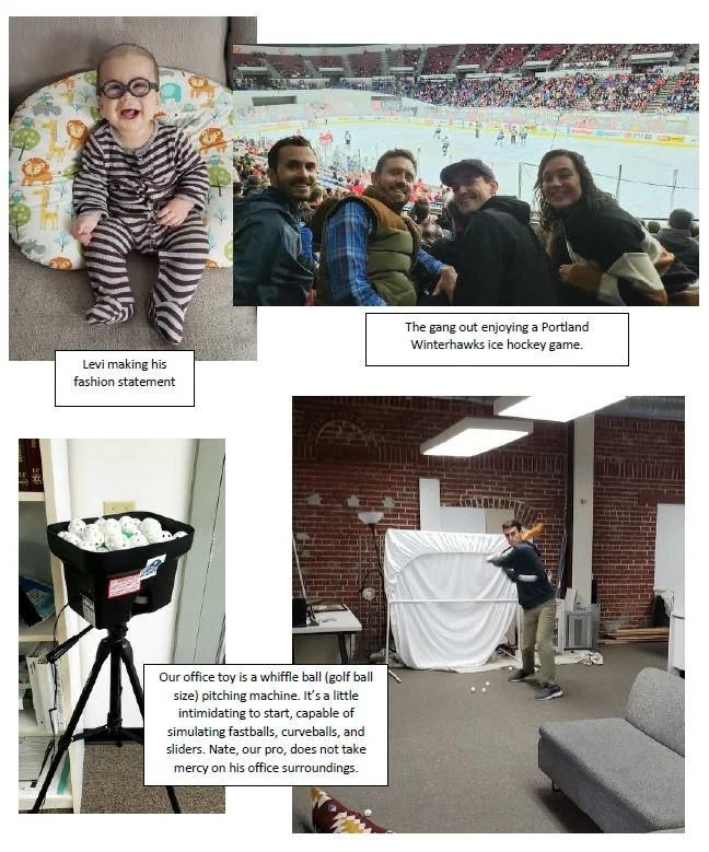 Happy New Year to our friends and clients! 2019 was a great (and quick) year for our Elevate family. We hit some important milestones including an office move from Nathan’s spare room to our new St Johns office and we received our 50th project. It seems like just a blink of the eye since we received that coveted project #1 in 2017, thank you Gerding Edlen! The highlight of last year was onboarding our new engineer, Dave Furrer. He is a WSU grad hailing from Olympia WA and he previously worked on the east coast for the US Army Corps of Engineers. Elevate is lucky to have landed his talent in his return to the Pacific Northwest. His technical skills and management ability have quickly exceeded our expectations. He is planning to take the PE exam this year (Professional Engineering License). The secret is out…no pressure, Dave! In the new year, we are excited to be rolling out two new company tools. First, the field software we are using (and that you’ll be seeing). We are moving to a built for construction platform/app called BuildUp for contractor checklists and issue/task management. The BuildUp user interface and the effectiveness of the app for these deliverables is just awesome. Secondly, we are implementing a tried and true (nerdy) software called Universal Translator (UT). We have successfully piloted UT on several projects to quickly and more effectively analyze trend log data, the most telling information on how well your building is performing. We think UT will be an asset of ours for years to come. One of our founding pillars is to be engaged in our community as a business. Our “1% for the Planet” membership is one of the methods we use to financially support this commitment. Through our partnership with Wild Salmon Center, 1% of our gross revenue in 2019 was donated to support their projects. In one sentence, Wild Salmon Center works with local communities to restore or preserve native salmon runs here in the Pacific Northwest, BC Canada, Alaska, and believe it or not, Russia, which is home to some of the strongest remaining Salmon runs in the world. We hope that being part of the broader conservation solution will inspire other businesses to do the same. Catie and Caleb welcomed baby boy #2 on July 1st. That’s what they’re calling him, boy #2, not even capitalized. Ok fine…Levi. He’s healthy, smiley, and has vision that needs to catch up, so he is wearing glasses. Infants with glasses…off the chart on the cute scale. Levi’s parents currently enjoy daydreaming about sleeping through the night and having time to watch a Netfix show. #notgonnahappen While we hit on the Elevate high notes which may read like an “Everything is Awesome” manifesto (some of us re-watched The Lego Movie over Christmas break), 2019 did not come without challenges and tribulations that life brings. We hope through the ups, downs and hopefully more ups in the year ahead, you have a fulfilling 2020. And thank you so SO much for including us in your professional lives.